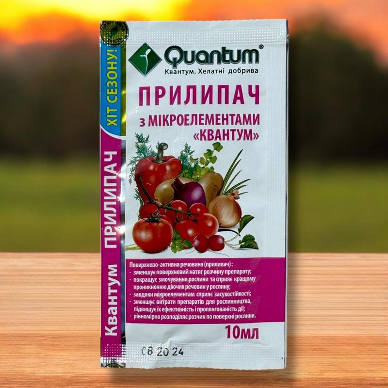 Прилипатель с микроэлементами Quantum Украина Данный препарат Квантум относится к разряду поверхностно-активных веществ, которые применяются для улучшения эффективности фунгицидных и инсектицидных препаратов, значительно облегчая уход за сельскохозяйственными растениями. Прилипатель содержит специальную композицию неионногенных ПАВ, кремниево- калийное микроудобрение, микроэлементы (медь, цинк, марганец, бор, железо), обеспечивающее полноценный рост и жизнедеятельность культур. Данный препарат способствует равномерному распределению активных компонентов по поверхности листьев, улучшая их проникновение в ткани растений. Такое улучшение обработки сказывается положительно на качестве и экономии используемого раствора. Кроме того, Квантум повышает способность проникновения активных веществ, особенно на поверхностях растений с плотным восковым или волосяным покровом. Прилипатель Квантум также повышает устойчивость к смыванию дождем, обеспечивая тесное сцепление раствора с поверхностью листьев за счет снижения поверхностного натяжения рабочего раствора. За счет подкормки микроэлементами в составе препарата, у обрабатываемых растений повышается устойчивость к засухе и повышается общий иммунитет. Прилипатель Квантум применяют для эффективной обработки картофеля, томатов, огурцов, баклажан, перца, кабачков, смородины, крыжовника, малины, клубники, яблони, абрикоса, груши, персика, сливы и других агрокультур инсектицидными, фунгицидными и гербицидными препаратами. Преимущества препарата Квантум - Поверхностно-активное вещество значительно уменьшает натяжение раствора - Прилипатель существенно увеличивает эффективность инсекто-фунгицидных препаратов, продлевает их воздействие - Микроэлементы вещества отличаются быстрым проникновением внутрь культуры - Средство всегда равномерно распределяет действующие вещества по всему растению - Кремниево-калийное микроудобрение в составе прилипателя стимулирует рост и плодоношение культивированных растений, способствует появлению устойчивости к засухе Инструкция, способ применения, состав, дозировка и норма расхода препарата Quantum прилипатель 10 мл Действующее вещество: композиция неионногенных ПАВ, кремниево-калийное микроудобрение, микроэлементы (медь, цинк, марганец, бор, железо). Содержимое пакета 10 мл растворить в 1 ведре (8-10 л воды) рабочего раствора средств защиты растений, либо удобрения. Тщательно размешать, и, придерживаясь инструкций основного препарата, произвести обработку растений, корней, клубней. Полученного объема раствора хватает на обработку площадью двух соток. Приготовленный раствор использовать в день его приготовления и не хранить более суток.