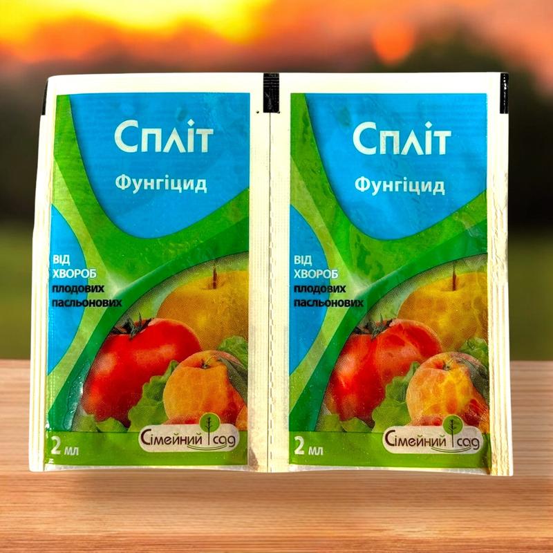 Фунгіцид системної дії Спліт Высокоэффективный фунгицид, применяется для обработки овощных и плодово- ягодных культур с целью лечения и профилактики различных грибковых заболеваний. Действующее вещество данного фунгицида проникает в растение, воздействует непосредственно на очаг поражения, останавливает рост зооспор и уничтожает патоген. При этом препарат обладает длительным периодом защиты от повторного заражения до 10 дней. Преимущества препарата Сплит - Не фитотоксичен для культур - Не смывается осадками и действует при высоких температурах - Безопасен для полезных насекомых - Может применяться для обработки посадочного материала Спліт інструкція, спосіб застосування і норми витрат фунгіциду 2 мл Культура Хвороби Норми витрати Спосіб і строки обробки Яблуня Парша, борошниста роса 2 мл на 10 л води Обприскування в період вегетації Груша Парша 2 мл на 10 л води Персик Курчавість листя 2 мл на 10 л води Картопля, томати Альтернаріоз 5 мл води 5 л води на 1 сотку
