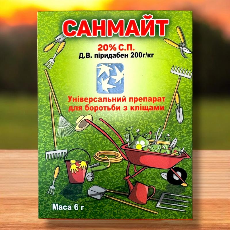 Препарат від кліщів на рослинах Санмайт Чарівна грядка Україна Контактний акарицид Санмайт застосовується для обробки сільськогосподарських культур проти всіх видів рослиноїдних кліщів. Даний препарат містить у складі діючу речовину пірибаден, яка має швидкий паралізуючий ефект і тривалу залишкову дію. Вже через півтори години після контакту з препаратом кліщі перестають харчуватися та гинуть протягом кількох днів. Даний засіб ефективно знищує кліщів на всіх стадіях їх розвитку, запобігає появі нових поколінь паразитів, а також здатний надавати побічний інсектицидний вплив проти шкідників, що смокчуть плодових культур: попелиці, цикадки, листоблошки, білокрилки, трипса. Акарицид Санмайт успішно використовується для захисту яблуні, груші, персика, вишні, черешні, смородини, малини, полуниці, суниці, аґрусу, винограду, томатів, капусти, огірків, перцю, троянди, гвоздики від червоного кліща, повстяного кліща, павутин. галового кліща, суничного кліща, брунькового кліща, плоских кліщів, цикламенового кліща, кореневого цибулинного кліща, бурого кліща, кліща шлехтендалю та інших видів. Переваги препарату проти кліщів Санмайт 20% - Засіб не завдає шкоди оброблюваним культурам та навколишньому середовищу - Препарат не викликає резистентності у шкідників - Даний засіб здатний надавати інсектицидну дію проти деяких видів сисних шкідників плодових культур - Препарат зберігає свої властивості незалежно від перепадів температур - Цей акарицид сумісний з іншими препаратами в бакових сумішах, крім лужних - Акарицид Санмайт ефективний у застосуванні проти всіх стадій розвитку кліщів - Даний продукт має швидкодіючий ефект Інструкція, спосіб застосування, склад, дозування та норма витрати акарициду Санмайт 20% 6 г Діюча речовина: піридабен 200 г/кг Особливості застосування препарату Санмайт: Вміст одного пакета (6 г) розчинити в 10 л води і свіжоприготованим розчином обробити 1 сотку насаджень. Краще обприскувати рослини після цвітіння, коли чисельність кліщів досягає свого піку. Найкращий ефект досягається при максимально рівномірному покритті листя робочим розчином. Рекомендується обприскувати рослини в суху безвітряну погоду при мінімальній швидкості вітру в ранкові або вечірні години. Наноситься на дерева лише один раз за сезон. Термін очікування складає 30 днів.