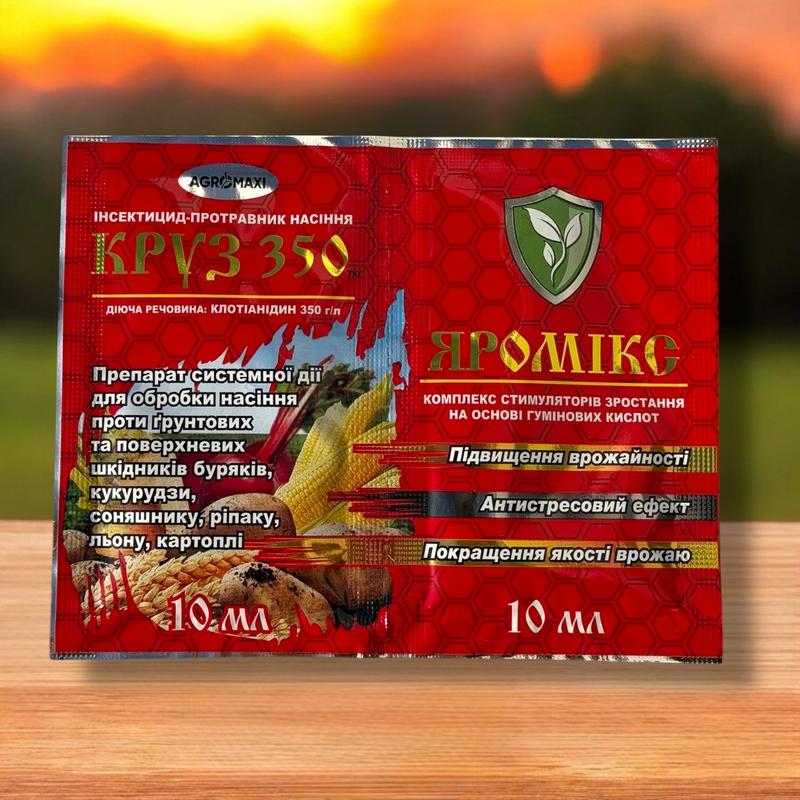 Інсектицидний протруйник Круз 350 плюс стимулятор росту Яромікс Agromaxi Україна Інсектицид системної дії Круз у комплекті зі стимулятором росту Яромікс застосовують для обробки посівного матеріалу (бульб, насіння) зернових, технічних культур і картоплі перед посадкою. Передпосівна обробка інсектицидом є ефективним способом захисту посівів із моменту висадки в ґрунт. Це особливо необхідно на початку вегетаційного періоду, коли молоді сходи найбільш схильні до навали комах, які пошкоджують кореневу систему і надземну частину рослин. При обробці діюча речовина препарату -- клотіанідин (clothianidin) проникає у насіннєвий матеріал, поширюючись у надземну частину культури по мірі проростання і формування нових пагонів. При контакті шкідників з обробленою зоною, речовина викликає незворотні зміни рецепторів їх нервової системи, спричиняючи параліч і загибель. Наявність органічного добрива з додаванням гумінових речовин покращує родючість і структуру ґрунту. Завдяки цьому у культури активно формується коренева система і покращується надходження поживних речовин і води. Бурштинова кислота покращує енергообмін у клітинах рослин, що дозволяє їм швидше відновлюватися після пошкоджень або несприятливих умов. У результаті збільшується врожайність рослин, підвищується імунітет і стійкість до хвороб. Обробки препаратом Круз 350 + Яромікс забезпечують комплексний захист цукрового буряку, картоплі, соняшника, кукурудзи, ячменю, ріпаку, льону від ґрунтових (дротяника, личинки хруща, капустянки) і наземних (колорадського жука, попелиці, довгоносика, блішки, хлібного туруна, шведської мухи) комах- шкідників. Переваги набору Круз 350 + добриво Яромікс Агромаксі - Протруйник характеризується швидким ефектом і тривалою залишковою дією проти шкідників - Інсектицид Круз 350 забезпечує ефективний контроль широкого спектра ґрунтових і наземних шкідників протягом вегетаційного періоду культури - Органічне добриво активує механізми адаптації рослин до несприятливих умов, знижуючи втрати врожаю - Додавання гумінових кислот покращує мікробіологічний склад ґрунту, підвищуючи врожайність і смакові якості продукції - Засіб зберігає ефективність у широкому діапазоні температур і вологості повітря - Препарат забезпечує захист від шкідників, що мешкають на прихованих ділянках рослин Інструкція, спосіб застосування, склад, дозування та норма витрати інсектициду Круз 350 10 мл та стимулятора росту Яромікс 10 мл Агромаксі Діюча речовина: клотіанідин 350 г/л, гумінові кислоти, бурштинова кислота, хелатні добрива Культура та норма витрати препарату: Культура Шкідники Норми витрати, мл/кг Буряк цукровий Комплекс ґрунтових та наземних шкідників 10 мл на 0.4-0.5 л води на 2 кг Картопля Колорадський жук, дротяники, комплекс ґрунтових та наземних шкідників 10 мл на 1.5-2 л води на 50 кг Соняшник Кукурудза Дротяники, попелиця, блішки, довгоносики, шведська муха і др. 10 мл на 0.4-0.5 л води на 2 кг Ячмінь Блошки, хлібний турун, попелиця та ін. 10 мл на 0.5-1 л води на 15 кг Ріпак, льон Комплекс ґрунтових та наземних шкідників 10 мл на 0.5-1 л води на 4 кг
