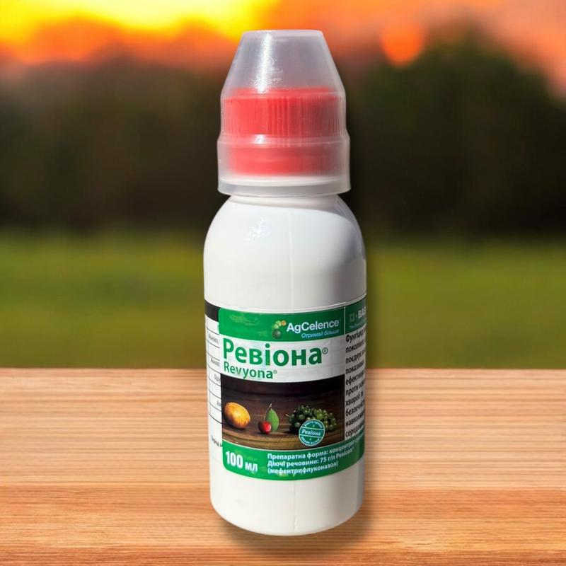 Фунгіцид «Ревіона» 100 мл для захисту багатьох культур Ревіона -- це системний фунгіцид у формі концентрату суспензії, призначений для контролю основних грибкових захворювань, що уражають плодові та овочеві культури. Препарат розроблений на основі інноваційної молекули Ревісол (ізопропанол-азол), діючою речовиною якої є мефентрифлуконазол (mefentrifluconazole). Ревісол відноситься до групи інгібіторів біосинтезу стеролів (ІБС) -- хімічний клас триазолів. Механізм дії -- блокування синтезу ергостерину, ключового компонента клітинної оболонки грибів, що призводить до її руйнування і загибелі патогену. Препарат попереджає проростання спор, проникнення інфекції в рослину і зупиняє розвиток міцелію на ранніх стадіях. Ефективність зберігається у широкому температурному діапазоні від +3 до +31°C. Переваги Ревіони: - Швидке поглинання і системна дія. - Захищає навіть необроблені частини рослин. - Має пролонговану дію за рахунок поступового вивільнення речовини з листків. - Безпечний для бджіл, дощових червів, водних організмів, птахів і ссавців. - Стійкий до змивання дощем (до 20 мм/год). - Добре фіксується на поверхні листя. Культури та хвороби: - Плодові дерева: яблуня, груша, слива, персик, черешня -- парша, борошниста роса, альтернаріоз, клястероспоріоз, мониліоз, коккомікоз. - Виноград: оїдіум, чорна гниль. - Овочі: картопля, томати, цибуля -- альтернаріоз, борошниста роса, плямистості. Інструкція та дозування: - Діюча речовина: Ревісол (мефентрифлуконазол), 75 г/л. - Період очікування до збору врожаю: - Яблуня, груша, черешня, слива, виноград -- 14 днів - Персик -- 20 днів - Картопля, томати, цибуля -- 7 днів - Сумісний з більшістю фунгіцидів та інсектицидів. Культура Норма расхода препарата, мл/сотку Способ обработки Кратность обработок Яблоня, груша 16-20 Мучнистая роса, парша альтернариоз 3 Черешня, слива 16-20 Монилиоз, мучнистая роса, коккомикоз, клястероспориоз 3 Персик 16-20 Монилиоз, парша, мучнистая роса, курчавость листьев, клястероспориоз 3 Виноград 8-13 Оидиум, черная гниль 3 Картофель 13 Альтернариоз 3 Томаты 15 Альтернариоз, мучнистая роса 3 Лук 15 Альтернариоз, пятнистости 3