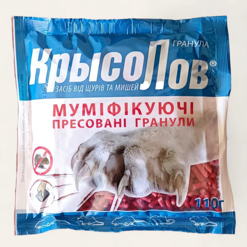 "КрысоЛов" в гранулах -- это высокоэффективный готовый к применению родентицид нового поколения весом 110 г, предназначенный для надежного уничтожения мышей и крыс в любых типах помещений и на приусадебных участках. Прессованные гранулы содержат мощный бродифакум, привлекательные пищевые компоненты и особые мумификаторы, которые предотвращают появление неприятного запаха погибших грызунов. * * * Надоела борьба с грызунами? Представляем "КрысоЛов" в гранулах -- ваше эффективное и гигиеничное решение для контроля над популяцией вредителей, обеспечивающее чистоту и спокойствие в вашем доме и на участке! Этот родентицид создан для максимального удобства и эффективности, гарантируя полное избавление от нежелательных "гостей" без лишних проблем. Почему "КрысоЛов" в гранулах -- ваш лучший выбор для борьбы с грызунами? - Высокая эффективность и надежность: Содержит бродифакум (0,005%) -- мощное действующее вещество, которое обеспечивает полное уничтожение грызунов. Приманка легко поедается вредителями, и эффект наступает на 4-5 день, с полным исчезновением популяции на 9-14 день. - Мумифицирующий эффект: В состав гранул включены специальные мумификаторы, которые замедляют процессы разложения погибших грызунов и предотвращают появление неприятных запахов. Это делает процесс дератизации значительно более гигиеничным и комфортным. - Непревзойденная привлекательность: Гранулы "КрысоЛов" обогащены специальными пищевыми компонентами, которые чрезвычайно привлекательны для мышей и крыс. Это гарантирует активное поедание приманки даже самыми осторожными особями. - Удобная форма и дозировка: Прессованные гранулы готовы к применению и просты в использовании. Одной упаковки весом 110 грамм достаточно для обработки территории от 40 до 80 м². Для крыс 110 г делится на 2 порции, для мышей -- на 4 порции, при этом каждая порция защищает до 20 м². - Широкий спектр применения: Идеально подходит для использования в жилых и нежилых помещениях (склады, подвалы, хозяйственные постройки), а также на приусадебных участках. - Низкая токсичность для окружающей среды: При соблюдении рекомендаций по применению, гранулы являются малотоксичными для окружающей среды. "КрысоЛов" в гранулах -- это гарантированное решение для эффективного, гигиеничного и безопасного избавления от грызунов! Применение: Разложите гранулы на подложках (картон, полиэтилен, лотки) или в специальных приманочных контейнерах. Размещайте их в местах обитания и перемещения грызунов: вдоль стен, под укрытиями, возле нор. Рекомендуется использовать защитные контейнеры (коробочки, отрезки труб) для предотвращения растаскивания приманки и ограничения доступа для домашних животных. Регулярно пополняйте приманку, не допуская ее полного поедания, до полного исчезновения грызунов. Меры предосторожности: Использовать только в перчатках. Хранить в недоступном для детей и домашних животных месте, отдельно от пищевых продуктов. При случайном контакте с кожей -- тщательно промыть водой с мылом. В случае проглатывания -- немедленно обратиться к врачу. Утилизировать остатки приманки и трупы грызунов как бытовые отходы. * * * Избавьтесь от грызунов быстро и гигиенично -- выбирайте "КрысоЛов" в гранулах уже сегодня!