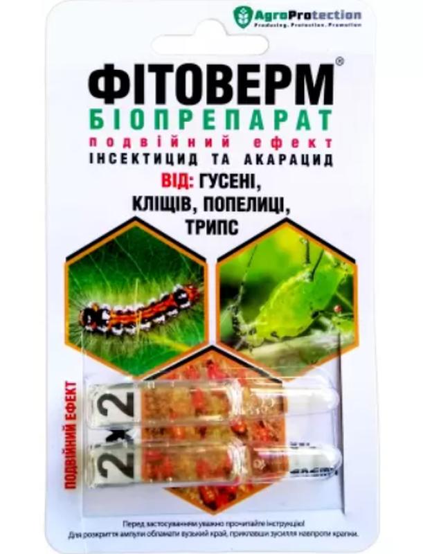 Фітоверм 2х2мл — біологічний інсектицид і акарицид для боротьби з гусеницями, кліщами, тлями, трипсами на овочевих, плодових, квіткових культурах, кімнатних рослинах. Фітоверм — препарат природного походження, вироблений ґрунтовими мікроорганізмами. Препарат не фитотоксичен. Активна речовина: аверсектин-С 2 г/л. Препаративна форма: к.е. - концентрат емульсії. Клас небезпеки: 3 — помірно небезпечна речовина. УВАГА! Препарат небезпечний для бджіл, обробка під час цвітіння заборонена. Препарат токсичний для риб, заборонена обробка поблизу водойм, не допускати потрапляння засобу у водойми. Інструкція із застосування інсектициду Фітоверм 2х2мл Вміст ампули розвести у воді відповідно до таблиці. Не користуватися харчовим посудом. Ретельно обприскувати рослини свіжоприготовленим розчином, рівномірно змочуючи листя. Оброблення проводити без дітей і тварин. Робочий розчин зберігання не підлягає. Культура Засіб Кількість води в літрах на 1 ампулу (2 мл) Кількість оброблень (інтервал) Хатні рослини, квіткові культури павутиний кліщ 1л 4 (7-10 днів) тли 0,25л трипси 0,2 л Огірки, томати, перці, баклажани захищеного ґрунту павутиний кліщ 2л 3 (15-20 днів) тли 0,3-0,5л трипси 0,25л Капуста гусениці білинок і совок 0,5л 2 Смородина, малина, ожина павутиний кліщ, гусениці пядениць, листоверток, лі 1л 2 Яблуня, груша Павутинний і плодові кліщі, листочки, плодоріжка 1л 2 Останнім обробленням необхідно провести за 2 дні, а на томатах за 3 дні до збирання врожаю. Не варто очікувати миттєвої загибелі комах відразу після оброблення препаратом. Через кілька годин після застосування комахи й кліщі перестають харчуватися й ушкоджувати рослини. Остаточна загибель шкідників настає через 3-5 днів. Заходи безпеки Фітоверм використовувати згідно з інструкцією. Під час роботи не вживати їжу, не пити й не курити, користуватися засобами індивідуального захисту. Після закінчення роботи прийняти душ і змінити одяг. У разі потрапляння препарату на шкіру або в очі промити їх чистою водою. У разі потрапляння в шлунок: прополоскати рот, очистити шлунок, вжити активоване вугілля, звернутися до лікаря. Зберігати в не пошкодженому оригінальному пакованні в сухому темному місці, недоступному для дітей і тварин, окремо від харчових продуктів і ліків, за температури від -20 °C до +30 °C. Термін зберігання: 5 років.