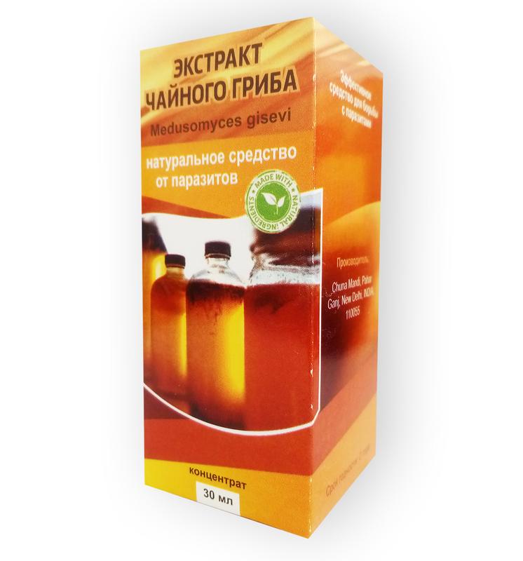 Ефективність Екстракту чайного гриба Переваги Екстракту чайного гриба перед синтетичними ліками очевидні. Адже він цілком природно позбавляє організм від паразитів, насичує вітамінами і при цьому не має побічних впливів, на відміну від хімічних ліків, які можуть пошкоджувати деякі органи або негативно впливати на роботу систем організму: викликати блювоту, нудоту, головні болі. При цьому засіб ще й виводить токсини з тіла, завдяки чому воно очищається і омолоджується. Результат дії препарат проявляється дуже швидко і незабаром після його прийому всі паразити на тілі помруть і назавжди покинуть своє колишнє місце проживання. Разом з тим уражені ними органи почнуть відновлюватися завдяки регенеруючі властивостями екстракту. Ні одне синтетичне ліки від паразитів не надає такого ефекту! Як діє Екстракт чайного гриба? Про чайне грибі напевно чули всі, але не кожен знаєте чим він корисний: активно бореться різними паразитами, які проникають в органи людини і ведуть там життєдіяльність; підвищує імунітет, активно знищує різні бактерії та віруси; вбиває гельмінти і інші чужорідні організми; екстракт володіє антитоксичними властивостями – він пов'язує токсичні молекули і сприяє їх виведенню з тіла: запобігає появі синьогнійної та кишкової палички, усуває стафиллококи; видаляє процеси гниття, які утворюються в кишечнику через паразитів; знищує яйця глистів; відновлює уражену паразитами шкіру і органи: легені, серце, шлунок, печінка. Курс лікування цим засобом складає 2 місяці, але він вбиває паразитів вже після першого застосування, а потім поступово очищає організм і позбавляє його від шкідливих речовин, а також налагоджує функціональність органів і систем. Склад Основним компонентом цього засобу є натуральний чайний гриб. Він являє собою комплекс з дріжджових грибків і оцтовокислих бактерій, які є біологічно активними мікроорганізмами. Завдяки їм чайний гриб має терапевтичний ефект і насичує організм поживними речовинами. Він здатний не тільки перешкоджати появі хвороб, але і виліковувати запущені захворювання. При цьому він вбиває паразитів і виводить їх з тіла людини. В Екстракті чайного гриба є цілий букет корисних мікроелементів: вітаміни А, В1, В2, В6, В12, РР, Д; каротиноїди; кальцій; магній; цинк; йод; гіалуронова кислота; фолієва кислота; аскорбінова кислота; вуглекислота; полісахариди; лактобактерії; дрожжевидные мікроорганізми; ферменти: протеаза, сахароза, амілаза, каталаза; природні пігменти. Екстракт чайного гриба повністю натуральний, без додавання хімічних матеріалів, тому він не має протипоказань. Для його прийому не потрібно призначення лікаря, тому що він прирівнюється до детокс-засобів. Всі лікарські трави для основи екстракту ростуть і збираються в екологічно чистих зонах планети.