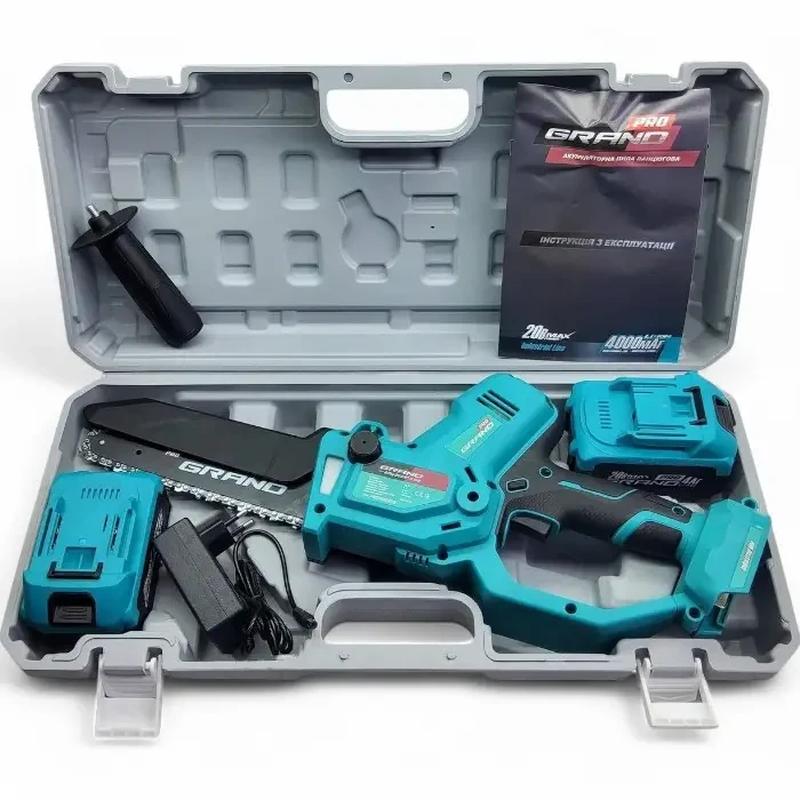 Аккумуляторная цепная пила Grand АПЦ-20V/8"-4 ind INDUSTRIAL (Чехия) Профессиональная цепная пила с бесщеточным двигателем, шиной длиной 203 мм (8 дюймов) и скоростью цепи до 1450 м/мин. Оснащена автоматической системой смазки цепи, тормозом и системой регулировки натяжения цепи, что обеспечивает удобство и безопасность работы. Компактный и лёгкий корпус делает инструмент удобным в использовании, а эргономичный дизайн способствует комфортной работе даже в ограниченном пространстве. В комплект входят два аккумулятора (20В, 4 А*ч), зарядное устройство и кейс для хранения и транспортировки. Отличный выбор для бытовых и профессиональных задач. Характеристики: - Модель: Grand АПЦ-20V/8"-4 ind INDUSTRIAL - Тип двигателя: Бесщеточный - Тип аккумулятора: Li-Ion (тип М) - Напряжение аккумулятора: 20В - Емкость аккумулятора: 4Ач - Скорость цепи без нагрузки: 1450 м/мин - Смазка цепи: Автоматическая - Шаг цепи: 1,4" 47зв. - Длина шины: 203 мм (8 дюймов) - Дополнительная рукоятка: Есть - Зарядное устройство: Есть - Кейс: Есть - Время зарядки: 1,5 ч - Тип упаковки: Кейс - Гарантия (мес): 12 Особенности: - Использует макитовские аккумуляторы (тип М) - Оснащена бесщеточным двигателем - Удобный в использовании дизайн - Небольшие габариты и лёгкий вес - Автоматическая система смазки цепи - Удобная система регулировки натяжки цепи - Тормоз цепи - Уникальная конструкция обеспечивает высокую эффективность резки и аккуратный срез. Комплетация: - Пила Grand АПЦ-20V/M8"-4 - Аккумуляторы - 2 шт. - Шина - 1 шт. - Цепь - 2 шт. - Зарядное устройство - Руководство по эксплуатации - Кейс