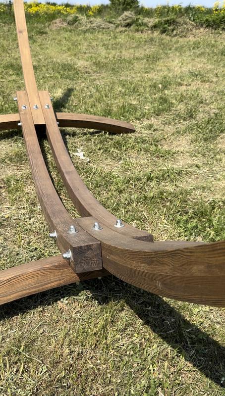 Дерев’яний тримач для гамака виготовлений із склеєного соснового брусу, із застосуванням водовідштовхуючих, нетоксичних матеріалів, та високої якості та міцності монтажно-підвісних деталей. Стійкий до дії сонячного проміння, а також до атмосферних умов. Допустиме навантаження до 250 кг. Загальна довжина 4 м , висота 1,5 м