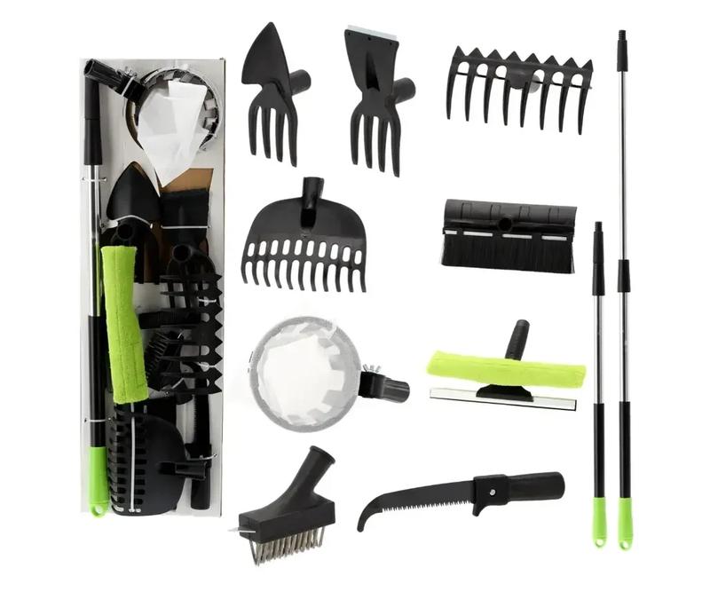 Універсальний набір садового інструменту 10 в 1 з телескопічною ручкою 124 см Багатофункціональний набір садового інвентарю стане незамінним помічником на дачі, у саду чи на присадибній ділянці. Завдяки телескопічній ручці, яка регулюється від 80 до 124 см, ви зможете працювати з комфортом і зберігати інструменти компактно. * * * ✅ У комплекті: - Телескопічна ручка (алюміній, 80-124 см) - Подвійна сапа - для перекопування і розпушування - Квадратна сапа - точна та зручна в роботі - Граблі для ґрунту - вирівнювання та аерація землі - Граблі для листя - легкі та ефективні - Збирач фруктів - легкий збір із дерев - Снігова щітка - прибирання снігу з будь-яких поверхонь - Пилка для обрізки - для гілок і чагарників - Скребок для бур'янів - видаляє мох, бруд і бур'яни між плиткою - Мийка для вікон зі скребком - для скла та гладких поверхонь * * * 🔧 Переваги: - Компактне зберігання - 10 насадок замість окремих інструментів - Швидка та зручна заміна насадок - Надійні матеріали - тривалий термін служби - Ергономічний дизайн - комфортна робота без зайвого навантаження