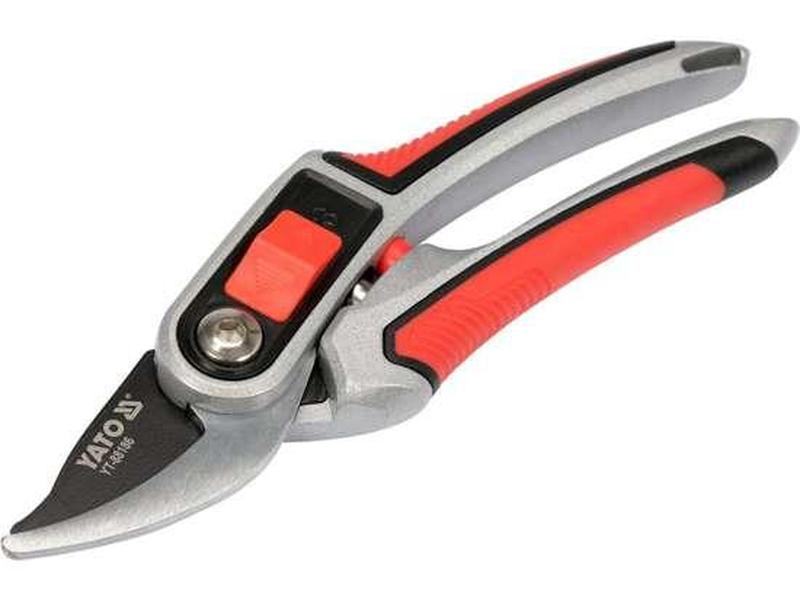 секатор округлые лезвия YATO YT-88186 регулируемые универсальные ножницы предназначены для обрезки веток и побегов, а также мокрых веток. - материал ручки алюминий, TPR, замок из АБС - материал лезвия SK5 (вверху), углеродистая сталь S50C (внизу) - отделка лезвия покрытие PTFE (сверху), хромирование (снизу) - твердость 54 (верхний нож), 46 (нижний нож) HRC - тип лезвия округлый - блокада - диаметр резки 20 мм - регулировка ширины открытия лезвия 12/20 мм - мягкий бампер TPR обеспечивает амортизацию разреза - размер 22х63х220 мм - вес 227 г