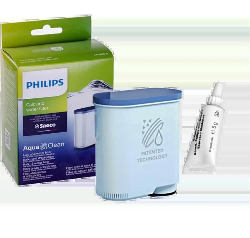Запатентований фільтр для води Philips AquaClean дає змогу готувати до 5000 чашок кави (впродовж двох років)* без очищення автоматичної кавомашини від накипу. Очищена вода забезпечує чудовий смак кави. Фільтр необхідно замінювати що 3 місяці. Ретельне очищення води завдяки запатентованій технології циркуляції Сумісність: Підходить для кавомашин Philips і Saeco Продуктивність Кожна фільтрувальна касета розрахована на 625 чашок напою. Виробник пропонує виріб, що поєднує в собі такі технології: - Дрібнопористий фільтр — затримує навіть дрібні частинки домішок. - Іонний обмін — для ефективного видалення кальцію та захисту від утворення накипу на деталях кавомашини. - Специфічна система подавання води, яка забезпечує автоматичну кавомашину тільки чистою рідиною без домішок. Мастило для кавомашин Saeco — 5 г Комплексний догляд за кавомашиною - це один з головних секретів ідеальної кави! Навіщо цей засіб? Мастило механізмів кавомашини запобігає тертю деталей і допомагає зберегти їх в ідеальному стані протягом тривалого часу. Але не будь-яке мастило підійде для догляду за кавоваркою! Компанія Saeco розробила цей засіб з урахуванням всіх тонкощів роботи кавомашини!