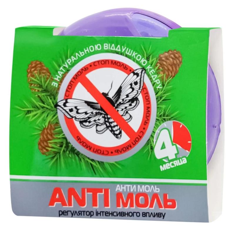 Захистіть улюблений одяг, використовуючи засіб від молі Antimol із запахом кедру. Продукт являє собою контейнер з кришкою невеликого розміру, який приклеюється до будь-якої поверхні. Розмістіть його у шафі чи комоді — і забудьте про міль назавжди! Засіб відлякує комах запахом, інтенсивність його поширення можна регулювати. Завдяки натуральній віддушці засіб ефективно справляється з міллю, при цьому не завдає шкоди здоров'ю людей.