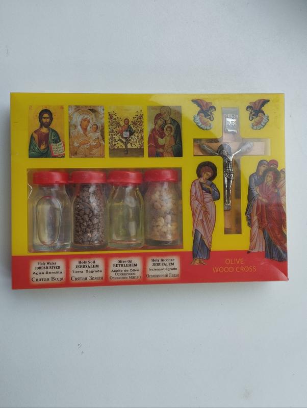 В упаковке находится: бутилочки со Святой землей изгороди, со Святой водой изгороди, с Освещенным оливковым маслом, Освященным ладаном и Освещенный крест из натурального дерева - оливы. Святую землю, воду и другие аксессуары можно поставить на полку у икон, можно посыпать/полить вокруг дома (или положить у входа), чтобы защитить дом от нападов и горестей войны.