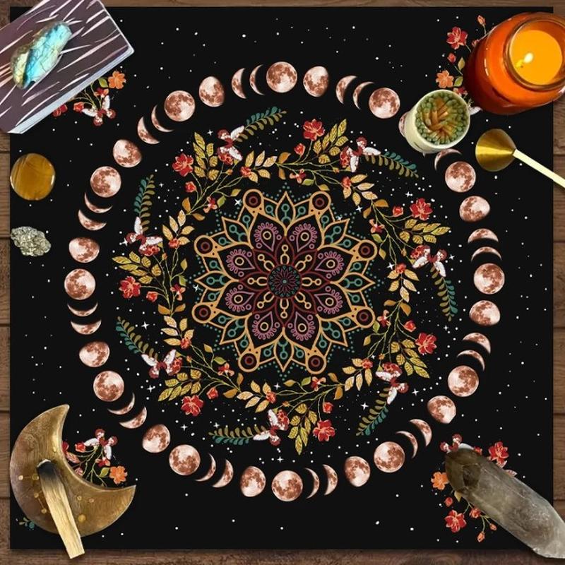 Скатерть для таро и рун с мандалой цветами и фазами луны а алтарное покрывало черное