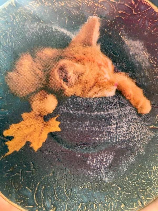 Осінній кіт / cat miniature / Kätzchen Dekoteller Мініатюра Декоративне авторське блюдце з колекції «Дика природа, домашні тварини і птахи 2019» Діаметр 11 см В комплект входить декоративна підставка з дерева або пластику на Ваш вибір} Використовуючи декоративну підставку, блюдце можна розміщувати на полиці, комоді, каміні або столі. В єдиному екземплярі. Обміну, повернення – ні. Мотив ідеально підійде в якості осіннього подарунка для любителів тварин, а також для всіх щасливих володарів рудих котиків}.