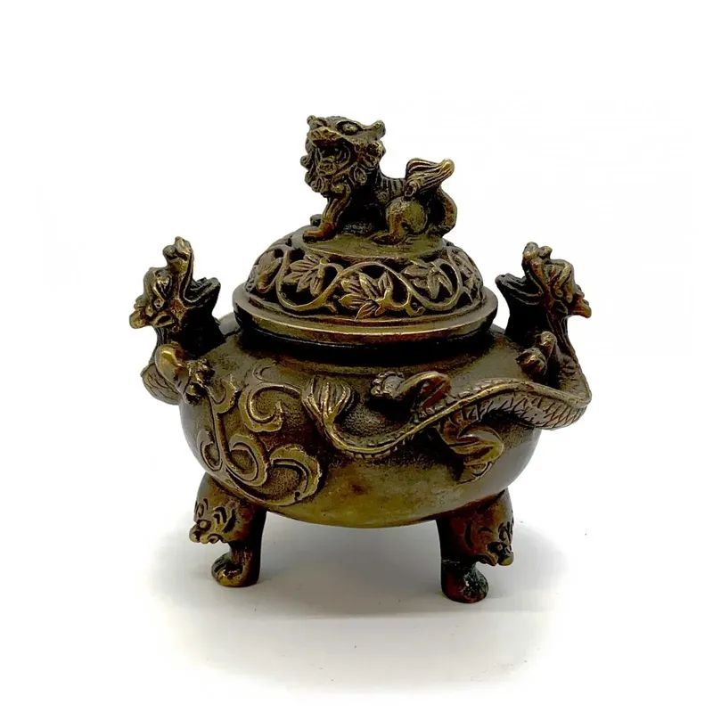 Аромакурительниця "Китайський лев та дракони" - це чудовий бронзовий виріб, створений методом лиття. Її чудовий дизайн та унікальні деталі надають особливого шарму та вишуканості вашому інтер'єру. Висота курниці становить 100 мм, а ширина – 110 мм. Діаметр шийки дорівнює 55 мм, а загальний діаметр – 110 мм. Кришка виробу прикрашена китайським левом в оточенні лотосів, а з боків розташовані два китайські дракони з ліліями, які служать не лише прикрасою, але й функціональними ручками для зручного відкривання та закривання. Аромакурителька стоїть на трьох підніжках, які надають їй стійкості та елегантності. Використовуйте ароматизатор для ароматичних смол або інших ароматичних матеріалів, щоб створити приємну атмосферу і поширити ніжний аромат у вашому будинку або офісі. Просто розмістіть ароматичні матеріали всередині курительки, закрийте кришку та насолоджуйтесь їхньою пахощами. Крім того, аромакурителька "Китайський лев та дракони" стане чудовим елементом декору, який привнесе нотку елегантності та стилю у ваш інтер'єр. Її унікальний дизайн та якісне виконання з бронзи приваблять захоплені погляди та підкреслять вашу тонкість смаку.