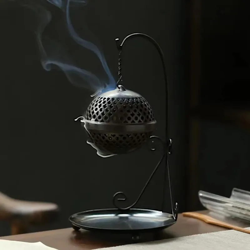 Ця витончена підставка для пахощів виконана у вигляді напівсферичної ажурної конструкції, підвішеної на витонченому металевому штативі. Її витончений дизайн гармонійно поєднується з практичністю: отвори в куполі дозволяють диму пахощів легко поширюватися, створюючи атмосферу затишку та спокою. Нижня тарілочка служить для збирання попелу, зберігаючи чистоту поверхні. Ідеальне рішення для тих, хто цінує естетику та комфорт в інтер'єрі, створюючи куточок для медитації та розслаблення. Підставка виготовлена з металу, а куля з кераміки. Висота: 24 см Діаметр нижньої підставки: 13 см Діаметр сфери: 8,9 ми Вага: 305 грам