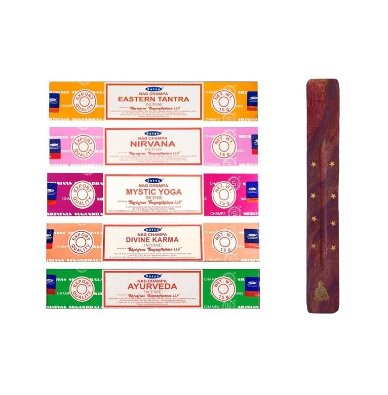 Набір ароматичних паличок сатья 5 пачок + лижа під пахощі, набір пахощів satya індія