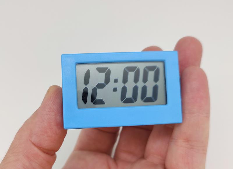 Годинник настільний електронний міні (сині), довжина корпусу 5,10 см., висота 3,20 см., глибина 2,50 см., формат часу 12-годинного, перегляд і регулювання (довге натискання) здійснюється двома кнопками, які розташовано з правого боку на корпусі (М -- вибір режиму, який треба відрегулювати, S -- регулювання), вага 19.30 грм, батарейка-таблетка LR1130 у комплекті.