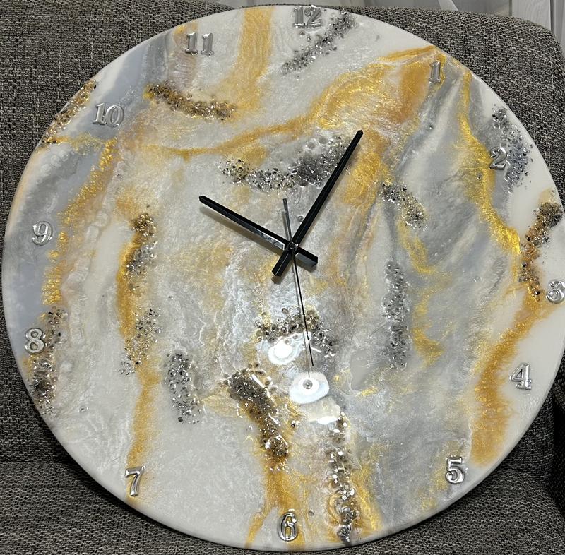 Годинник ручної роботи, діаметр 60 см ., в білих, срібних та золотих кольорах, прикрашений дзеркальною крихтою