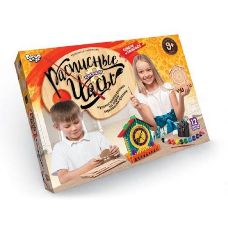 Годинник-конструктор "Домик". Зберіть деталі заготівки-конструктора для збирання годинника, з'єднайте інші деталі конструктора. Потім, за допомогою губки, проґрунтуйте годинник білою фарбою (в наборі), розфарбуйте годинник. Одягніть часову, потім хвилинну та секундну стрілки на годинник._ Бренд: Dankotoys Паковання: Коробка Колір: Різнобарв Вага в упаковці: 480 г Габарити в упаковці: 34 x 3.5 x 25.5 см Габарити без паковання: 34 x 4 x 26 см Страна виробник: Україна Матеріал: Дерево Комплектація: Деталі годинника (стрілки, годинниковий механізм, елементи конструкції), фарби (12 кольорів), пензлик, губка, фарба для ґрунтування, інструкція