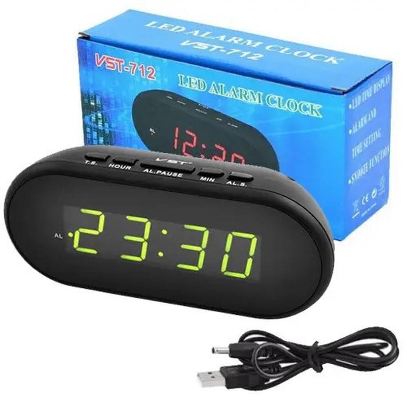 Часы настольные цифровые будильник с LED подсветкой VST 712-2 Чёрные Часы настольные VST 712, с яркой подсветкой электронного циферблата, украсят своим стильным дизайном вашу комнату или рабочий офис. Форма часов – классическая, прямоугольная, плоский корпус держится на широкой устойчивой ножке-основании, под небольшим углом. Светодиодный дисплей прибора проинформирует вас о времени, а также о том, включён ли будильник (для этого есть маленький диод-индикатор с левой стороны). Цифры на экране высокие, чёткие, время хорошо видно и в солнечный день, и в тёмное время суток при выключенном свете. Характеристики: - Питание от сети 220В + запасное питание от 2-ух батареек типа AAA (не сбиваются настройки после отключения электричества) - Размеры 145х45х65 мм - Настольные часы - LED дисплей зеленого цвета - Индикация 24/12. - Будильник Комплектация: 1. Часы 2. Шнур питания от USB 3. Инструкция 4. Упаковка
