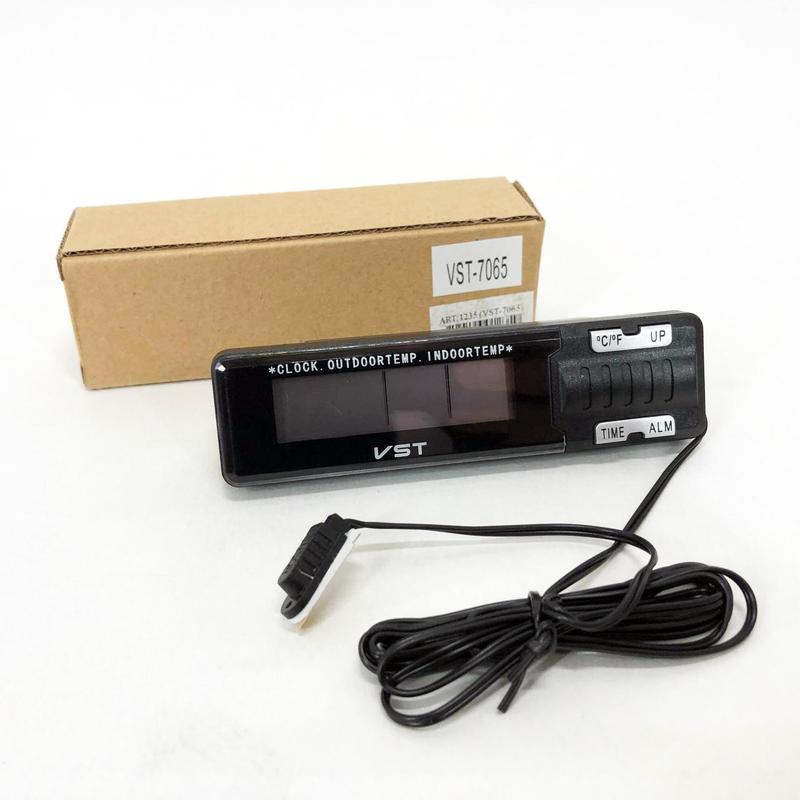 Внутренний и наружный термометр с часами VST-7065 Электронный градусник показывает температуру внутри помещения и снаружи, а также время. Прибор идеально подходит для использования в автомобилях. Технические характеристики VST-7065: - Диапазон измерения температуры: -50…+70°С - Шкала деления температуры - 0,1°С - Правильность показаний температуры: ±1°С - Длина шнура выносного датчика приблизительно 2 метра - Питание: 1.5V(AA size)х1шт - Будильник - Габаритные размеры - 120х30х25мм - Вес: до 150г