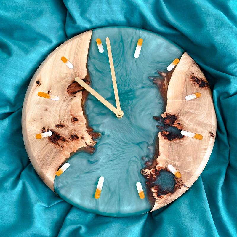 Настенные часы из серии EPOXY&WOOD - это воплощение природного совершенства дерева в сочетании с красотой эпоксидной смолы, в которую вложена частичка души мастера и его талант. Именно эти часы придадут особого шарма вашему дому, а также станут прекрасным подарком. Каждое изделие делается вручную и все узоры уникальны. Поэтому вы можете быть уверены, что ваших часов не будет больше ни у кого. Под ваш интерьер мы с радостью подберем породу дерева, удачную цветовую гамму и нужный размер. Срок изготовления - 14 дней. По вашему желанию упаковываем в подарочную деревянную коробку (+850 грн). Есть большой выбор часов в наличии (отправка в день заказа). Возможна международная доставка. Все детали уточняйте у менеджера. Дайте волю фантазии, и мы воплотим все ваши мечты в жизнь. - Порода дерева на выбор - тополь либо орех - Можно заказать во всех цветах и добавить гравировку - Размеры - до 150 см в диаметре - Цифры римские/арабские - Золотые/серебряные/черные стрелки и деления (на выбор) - Высокоточный бесшумный механизм с плавным ходом - Есть петля на механизме для подвешивания Интересно, как будут создаваться ваши часы? Смотрите обзор:
