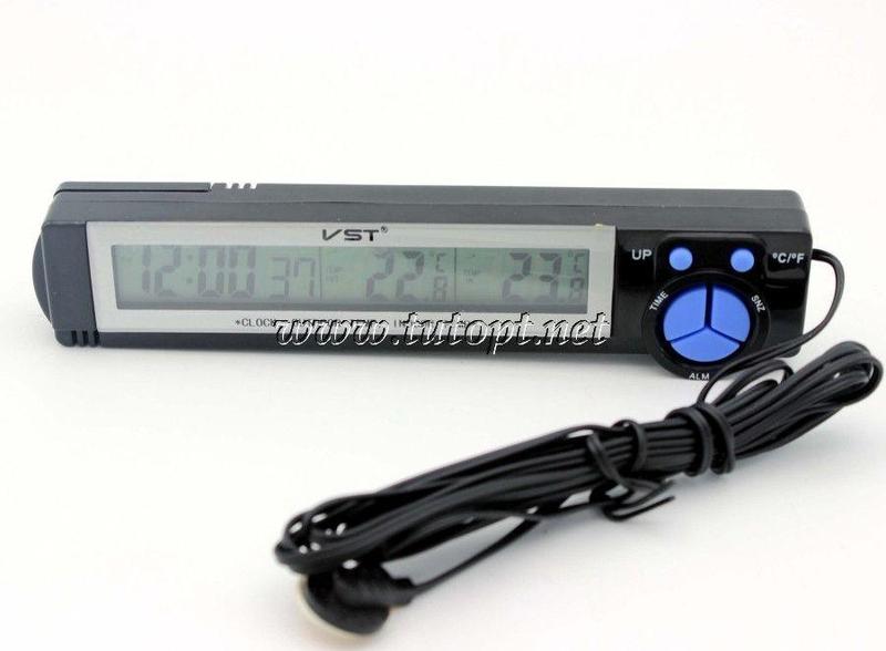 Автомобільний годинник VST 7043 Технічні характеристики: - Розміри: 161x43x25 мм; - Відображення годин / хвилин; - Виносний датчик зовнішньої температури, датчик внутрішньої температури, будильник, календар, секундомір, таймер; - Вбудований вольтметр (показує з точністю до десятих вольт); - Відображення температури на дисплеї внутрішньої та зовнішньої; - LCD-дисплей із синім підсвічуванням; - Напруга живлення: 12 Вольт; - Точність +/- 0.1 градус; - Робоча температура: -50 +40 градусів; - Час вимірювання температури: 20 секунд.