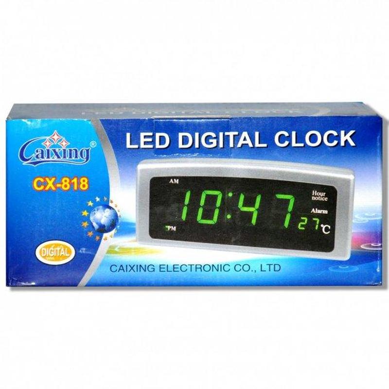 Годинник CX-818-2 зелений Опис: Електронний годинник CX-818-2 — це багатофункційний пристрій, поєднує в собі функції годинника, будильника та термометра. Завдяки великому цифровому дисплею з зеленим LED-підсвіткою, вони легко читаються навіть у темряві. Годинник підтримує як 12-годинний, так і 24-годинний формат зображення часу, , а також дають змогу встановити до 8 незалежних будильників із можливістю вибору мелодій. Регульована яскравість дисплея робить їх комфортними для використання у вечірню пору. Переваги: - Багатофункціональність: показує час, дату та температуру. - 8 незалежних будильників із вибором мелодій. - Регулювання яскравості дисплея, яке автоматично зменшується в нічну пору (22:00 - 6:00). - Літієва батарейка CR2032 підтримує настроювання під час вимкнення живлення. Характеристики: - Висота цифр: 3 см. - Формат часу: 12/24 години. - Діапазон вимірюваної температури: від -10 °C до +50 °C. - Живлення: від мережі 220 В. - Розміри: 21.5 см х 10 см х 3 см.
