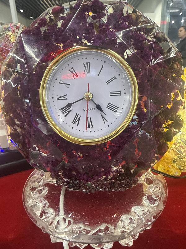 Кварцовий годинник з епоксидної смоли з гіпсофілою, бутонами троянди та натуральними камінцями гранату. Діаметр 14 см.