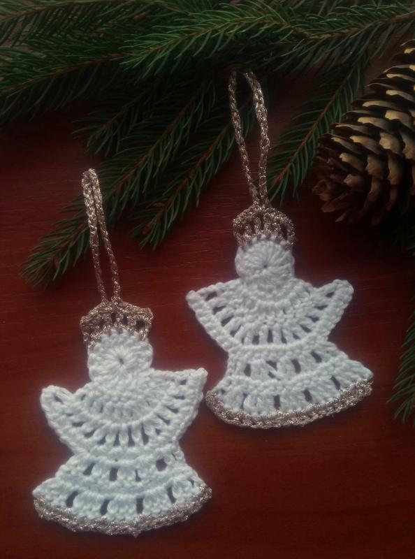 Новорічні в'язані Ангели в'язані гачком . Накрохмалені для надання жорсткості. Ангел можна повісити на ялинку або оформити новорічний подарунковий сувенір або подарунок.