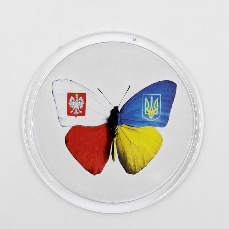 Патріотичний магніт метелик дружба україна польща круглий діаметр 65 мм, український сувен...