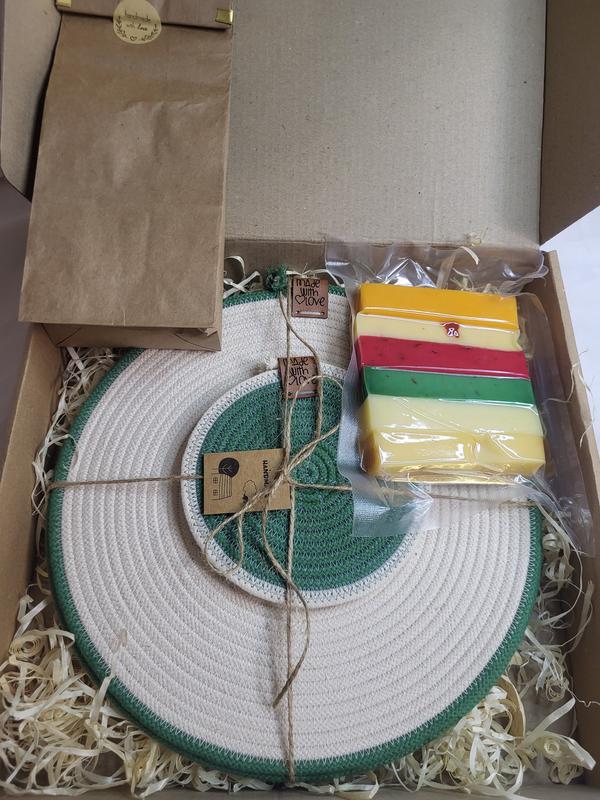 Подарунковий набір. Ручна робота. В набір входить: - підставки під тарілки 2 шт d 25 см - підставки під чашки 2 шт d 12 см - кава натуральна мелена 100% арабіка 100 грам - мікс сирів 150 грам - пакування Вироби ручної роботи виконанні із 100% бавовняного шнура Великий вибір кольорів.