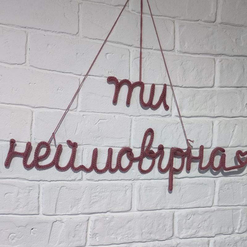 Чудовий напис для щоденного нагадування, що "ти неймовірна". Підійде як для декору оселі, так і для декору салону, офісу або студії. Виконаний в техніці трикотин- алюмінієва основа, ззовні в'язаний джгут. Довжина слова "ти"- 17 см, слова "неймовірна"- 62 см. Висота букви "н" 6 см, букви "в"- 12 см. Можливе виконання в іншому кольорі, розмірі, інші слова, написи, елементи (квіти, серця, метелики, корони тощо) Велика палітра кольорів.