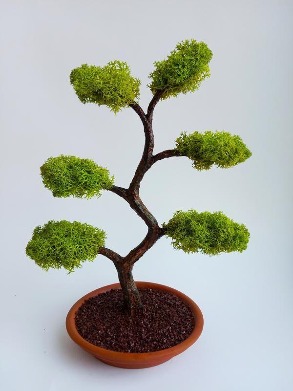 Дерево виконано в стилі Бонсай Мойоги. Висота близько 22 див. Мисочка з кераміки, декорована кам'яною крихтою. При повній передоплаті можливо виготовлення в іншому кольорі (червоному, помаранчевому, салатовому,колір зеленого яблука).
