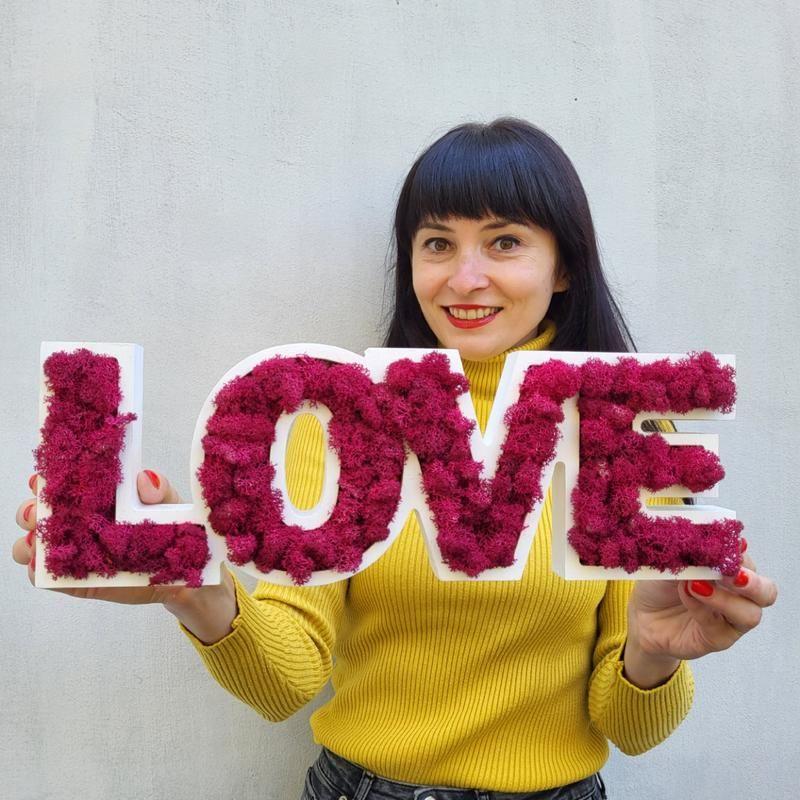 Літери лав, що самостійного стоять на столі чи іншій поверхні. Літери з дерева. Товщина 2.8 см. Літери наповнені Яскраво червоним мохом. Можна їх замовити з зеленим мохом та іншими кольорами. Довжина 40 см і висота 14 см. Чудовий декор і оригінальний подарунок до дня святого Валентина. Декор Вашого весілля, подарунок молодій парі на весілля, подарунок подружжю, Подарунок на річницю весілля. Подарунок чи декор, що прослужить до 10 років. Бо стільки мох не втрачає свого вигляду та кольору. Сам мох не потрібно поливати та ставити на сонці. Звісно, такі літери можуть завжди стояти у вашому домі на столі, полиці, комоді.