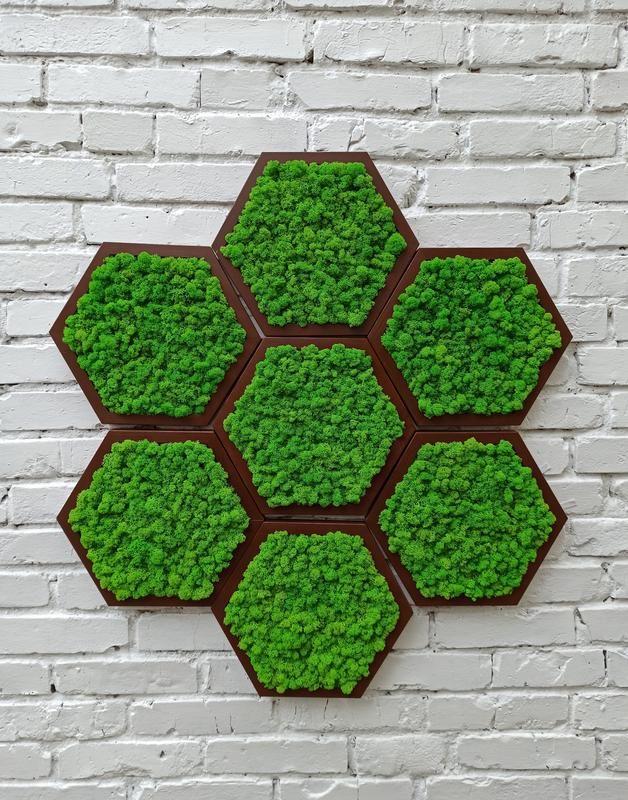 Сота з дерева, пофарбована в шоколадний колір та наповнена зеленим мохом. Сам мох служитиме до 10років. Його не потрібно поливати та ставити на сонці. Використання такого декору лише в приміщенні. Колір самої соти можна обрати різний і розмір теж. Тому перед замовленням, напишіть мені. Висота 20 см, ширина 25 см - 750 грн висота 25 см (ширина 29 см) -  900 грн Висота 30 см, ширина 35 см - 1150 грн. Висота 35 см, ширина 40 см - 1400 грн.