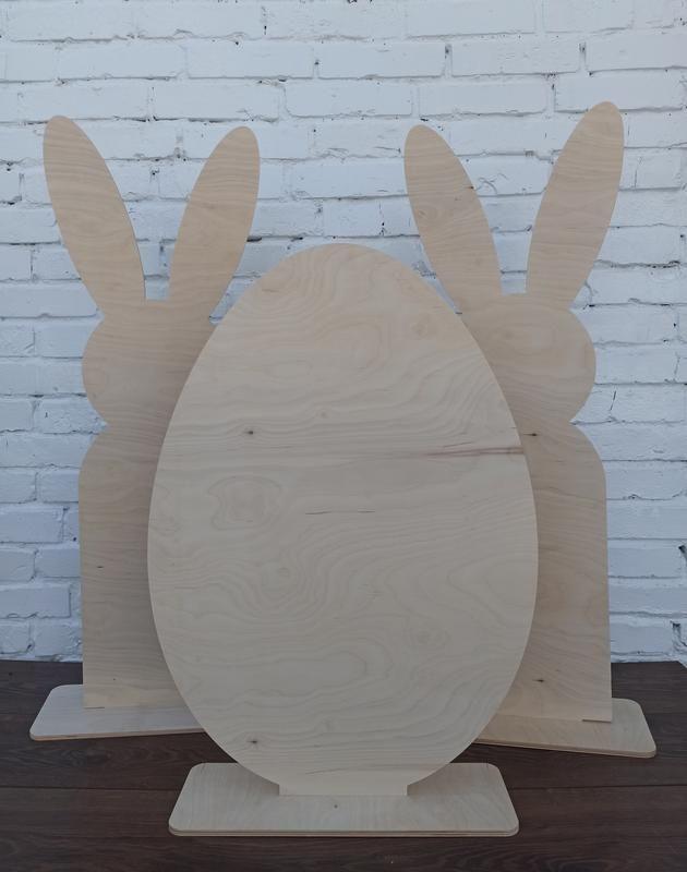 Пасхальні великодні зайці та пасхальне яйце на підставці для декору Матеріали - фанера 9 мм товщина. На фото Висота зайця 1 м З підставкою 101 див., А висота яйця 80 див. Для декору до Великодня різніх приміщень, будинків, закладів, декору фотозони до Великодня магазинів та ін Залюбки можна пофарбувати до прикладу в білий колір. Вартість фарбованих обумовлюється. Розмір теж готова виконати різний: