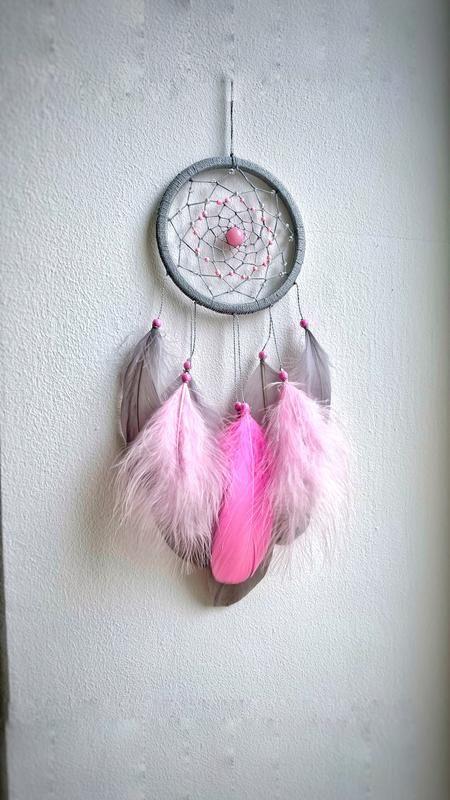 Маленький дівчачий ловець снів у гарному поєднанні кольорів сіро-рожевого відтінків. Ніжний, делікатний, гарно пасуватиме до дитячої кімнати для дівчинки, або й для спальні дорослої пані. Додасть впізнаваний бохо-шик стиль для вашої домівки! Розмір ловця снів хоч і не великий, але досить помітний в інтер’єрі , для когось це може бути додатковим плюсом, адже не забиратиме всю увагу на себе, а лише додасть точкової родзинки декору . Товар виготовляється на замовлення