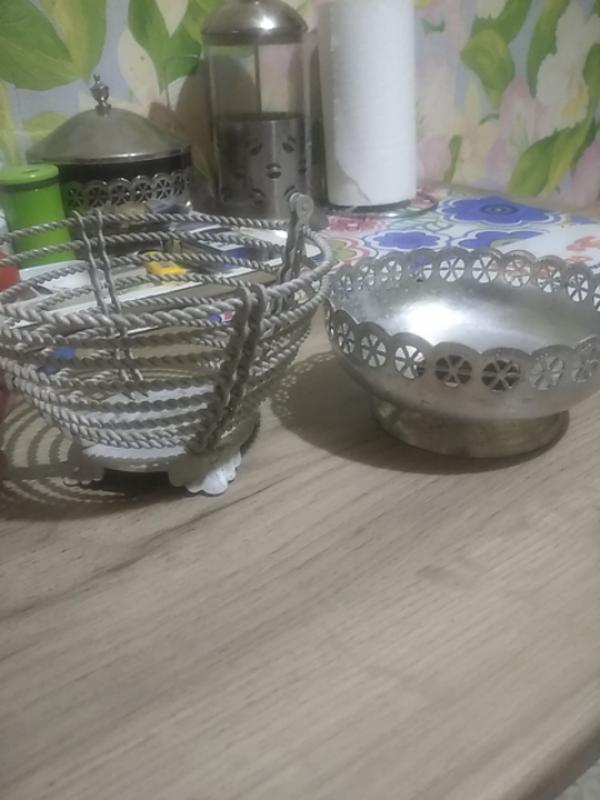 продам подставку под цветы или еще для чего нибудь , плетеную,из металла , не ржавеет, есть еще одна подставка ,из никеля, на фото показала, цена 109 грн, указана в обьявлении за подставку плетеную из металла, диаметр плетеной подставки верх 15 см, диаметр низа 8 см, высота 10 см, диаметр подставки из никеля, советского производства, раритет, верх 14 см, низ 9 см, высота 7 см, в нее можно поставить вазочку, красиво будет или тоже под горшочек с цветами, ее цена 199 грн