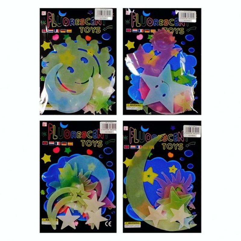 Набір з десяти флуоресцентних декорів з клейким кріпленням. Розміри наклейок: висота 2,5-12 см, ширина 2,5-13 см. В наборі 7-8 фігурок.