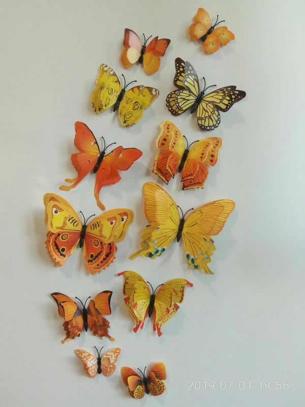Набір метеликів на магніті (12 шт.) + двосторонній скотч у комплекті. Розміри метеликів: 2 шт по 12 см*9 см, 2 шт. по 9 см*7,5 см, 4 шт 8 см*6 см, 4 шт. по 6 см*4 см. Стикери вологостійкі, виготовлені з тонкого пластику. Крильця вигинаються в потрібному напрямку. Клейаються на менш рівну поверхню.