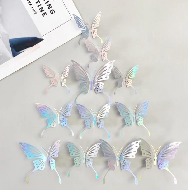 Декоративні метелики. Колір: срібло перламутрове. Матеріал: фольга. Кількість: 12 штук. Розмір: 4 штуки 12 на 9 см. 4 штуки 10 на 7 см. 4 штуки 8 на 6 см. В набір входить 2-х сторонній скотч.