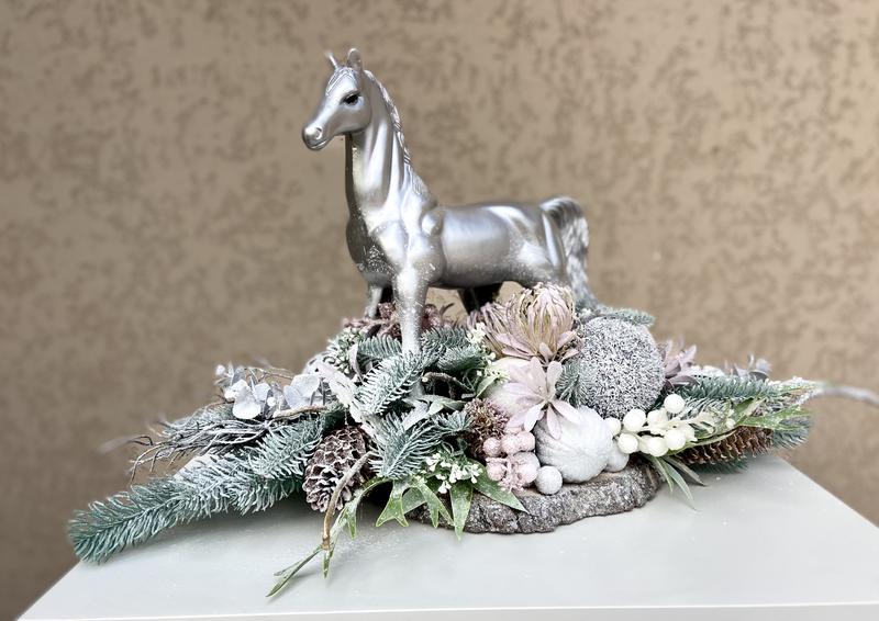 Серебристая лошадь 🐴 среди елочных веточек с натуральными шишками в сочетании с нежным розовым цветом на деревянном спиле, чем не 3UMoBa ka3ka?❄️❄️❄️ PS Не знаю, как вы сопримете композицию, а вот у меня-кень и зима это вещи родственные и, возможно в детстве слишком переняла песню « Три бежевых лошади» с - авторский дизайн прочная деревянная основа и капитальное крепление каждой детали - адекватная цена - возможно собрать в комплект несколько изделий - надежная упаковка при пересасывании Длина-75см Ширина - 35см Высота -36см