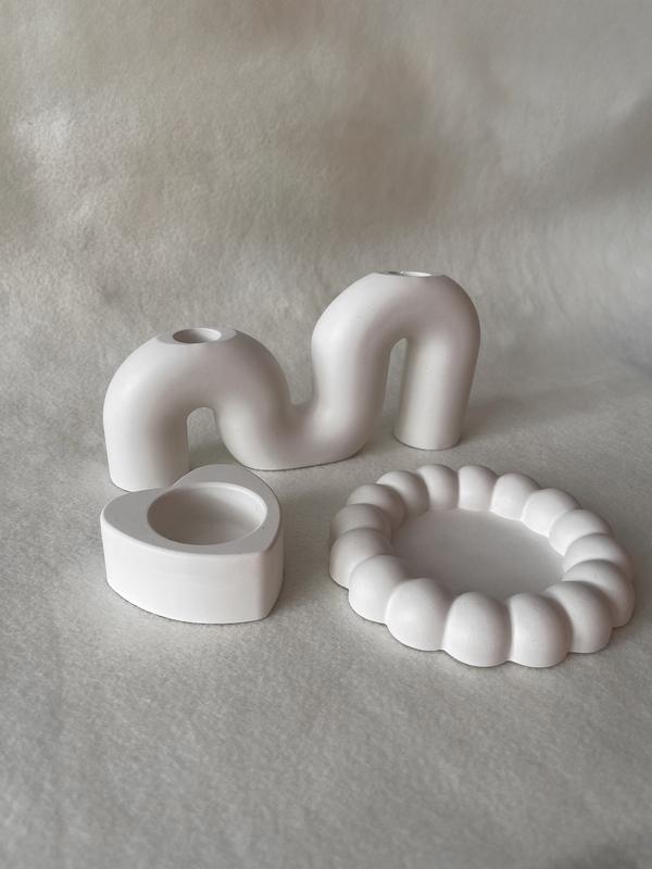 Набір гіпсового декору: - свічник на дві довгі свічки - свічник серце на маленьку круглу свічку - підставка (тарілочка)
