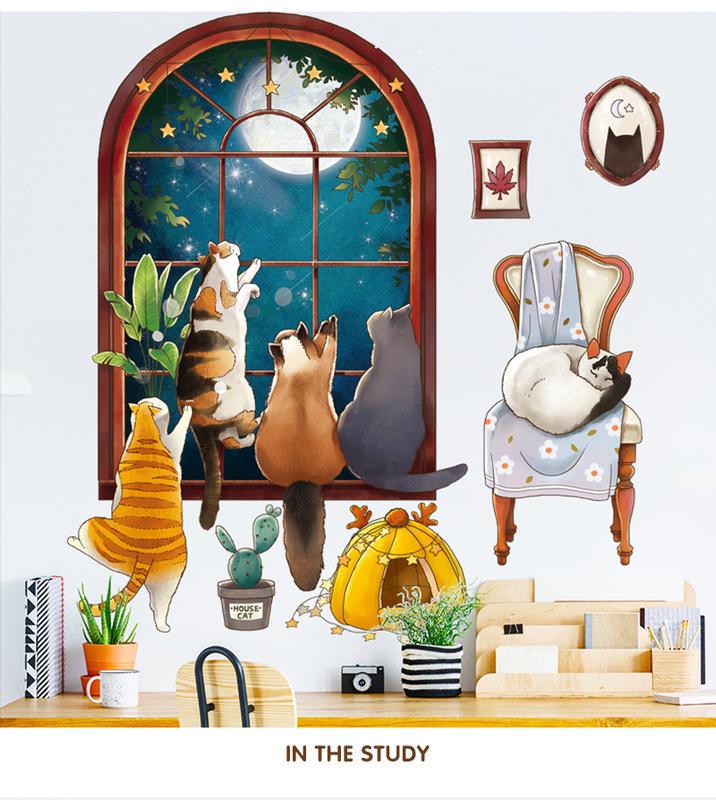 Приблизний розмір після наклеювання: 78 х 70 см. Усі елементи клеяться окремо Ви отримаєте наклейки на аркуші розміром 60 см*90 см, де компактно наклеєні всі коти та елементи композиції, дивіться на фото 2-го на сайті