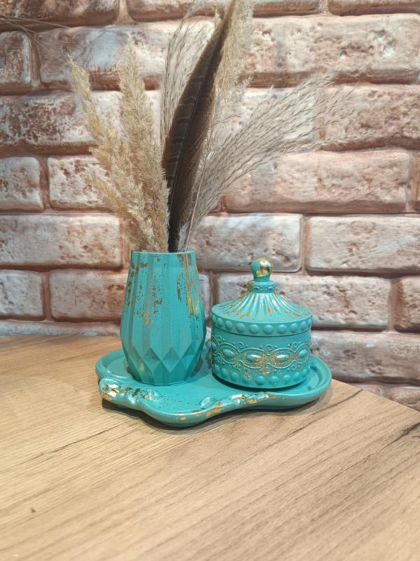 Декоративний набір в стилі "Tiffany" Не ОФОРМЛЯЙТЕ замовлення якщо ви не готові до оплати!!! Матеріал : гіпс. Розмір : Підставка 19.5* 16 см Ваза 10см * 7см. Шкатулка 10см*8 см. Покриття : лак.