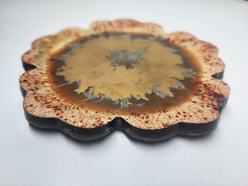 ✨ Унікальна підставка ручної роботи з епоксидної смоли стане стильним акцентом на вашому столі. Характеристики: Матеріал: епоксидна смола Форма: квітка Діаметр: 11,5 см Товщина: 5 мм Колір: золотисто-коричневий з ефектом мармуру Чому варто купити: 🛡 Захищає поверхню від плям і подряпин 💎 Ексклюзивний дизайн — кожна підставка неповторна 🎁 Чудовий подарунок для друзів і близьких ☕ Підходить для чашок, кухлів, келихів, прикрас