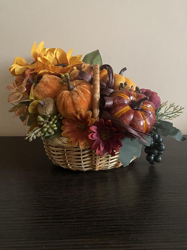Осіння композиція зі штучних квітів у кошику. Декор для дому.