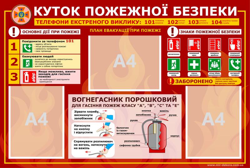 Інформаційний стенд "Куток пожежної безпеки" настінний. Друкується на самоклеючій плівці, яка наноситься на ПВХ товщиною 3 мм. Стенд оснащений трьома кишенями формату А4.