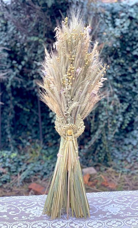 Дідух з пшениці, жита, овса, льону та маківок, прикрашений солом яним ангеликом